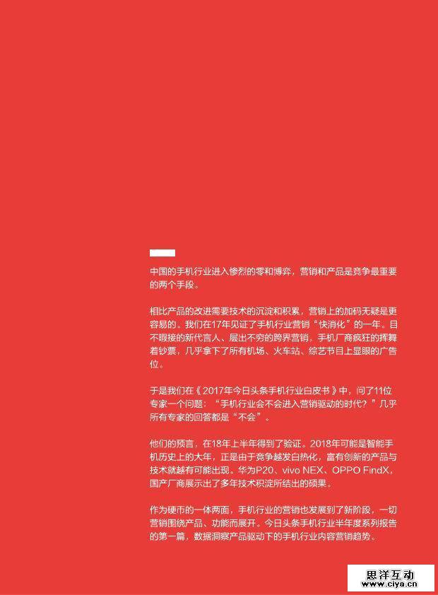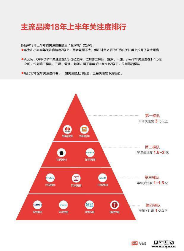 今日头条发布2018手机行业内容营销白皮书。白皮书显示,今年上半年,华为是最受消费者关注的手机品牌,和小米一起位列品牌关注度第一梯队,关注度达3亿以上,并与之后的品牌在关注度上拉开一定距离。苹果、OPPO上半年关注度在1.5-2亿之间,位列第二梯队。魅族、一加、vivo上半年关注度在1-1.5亿之间,位列第三梯队。三星、荣耀、魅蓝、锤子上半年关注度在1亿以下,位列第四梯队。