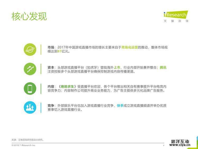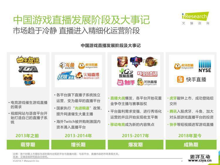 2018年游戏直播市场随着头部游戏直播平台的上市加剧了行业竞争态势,而整体行业也面临进一步整合。此外,不仅仅行业内部的竞争进一步加剧,外部娱乐平台如短视频平台也通过切入游戏直播变现游戏直播内容流量。整个行业在内部与外部竞争的双重压力下逐渐进化,向用户提供更具娱乐性的游戏直播体验。