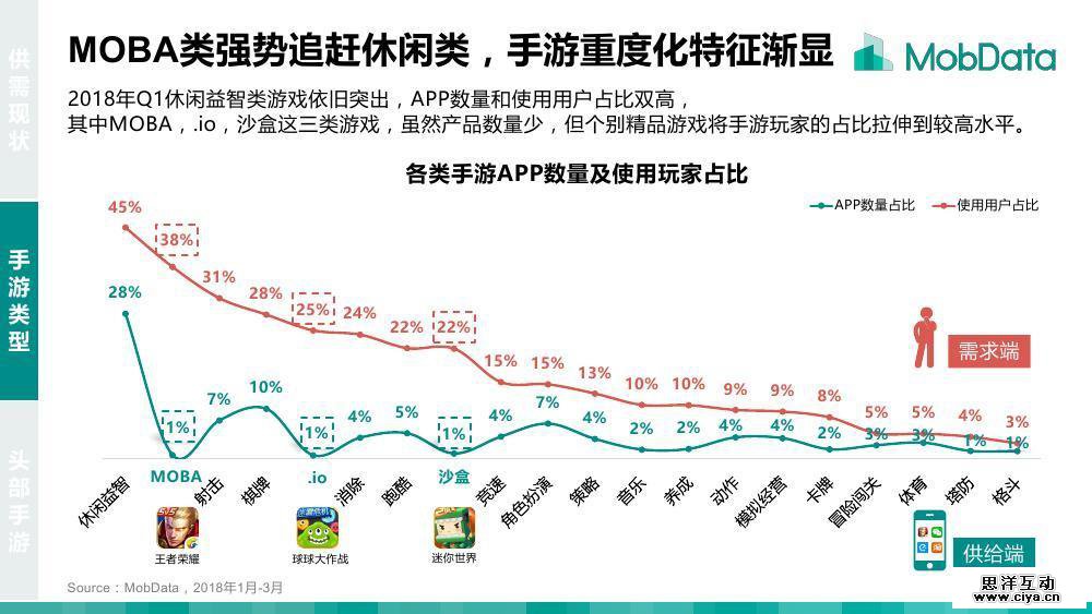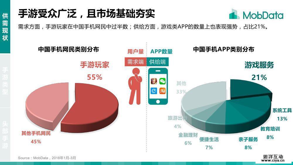 手游受众广泛,且市场基础夯实 广泛,且市场基础夯实。需求方面,手游玩家在中国手机网民中过半数;供给方面,游戏类APP的数量上也表现强势,占比21% 。