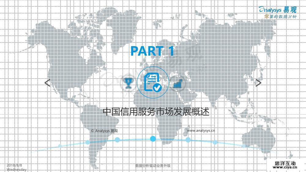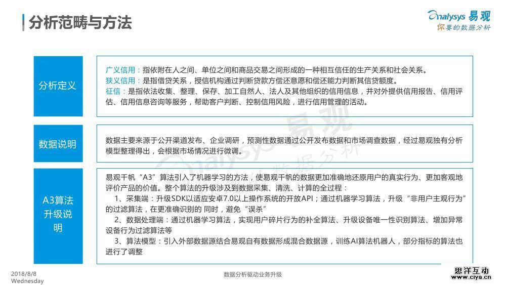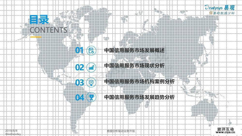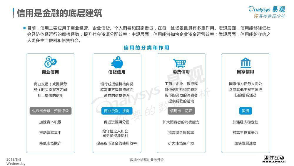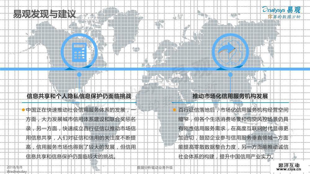2018年8月8日,易观发布了《中国信用服务市场专题分析2018》的报告。中国正在快速推动社会信用服务体系的发展,一方面,大力发展城市信用体系建设和联合奖惩名录,另一方面,快速成立百行征信以推动市场信用信息共享,人们对征信和信用的关注度不断提高,信用服务市场也得到了较大的发展,但信用信息共享和信息保护仍面临较大的挑战。