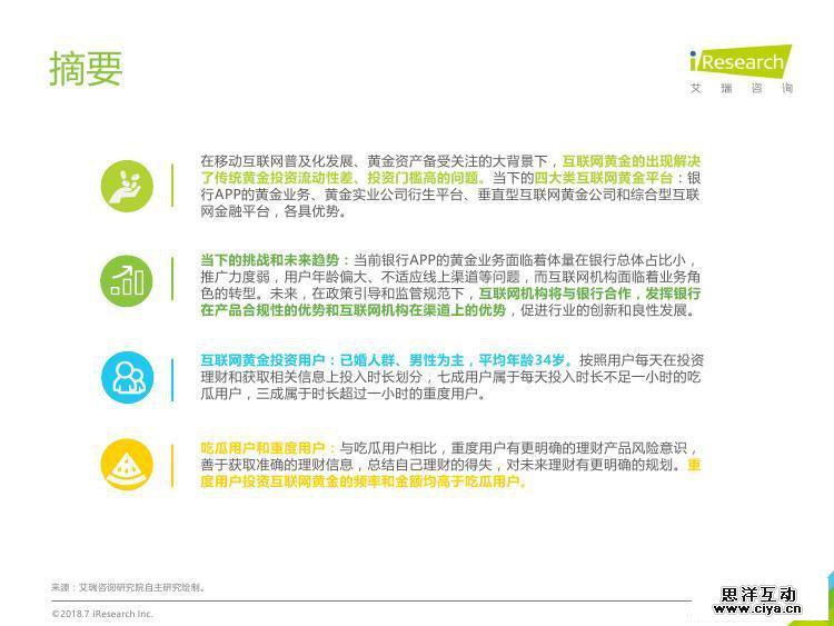 《2018年中国互联网黄金行业及用户研究报告》通过桌面研究和企业访谈的形式,研究互联网黄金行业的发展背景、发展历程、平台类型、产业链和典型企业,总结当前行业面临的挑战以及未来的发展趋势。通过对互联网黄金用户的深访和问卷调研,报告根据用户单日理财及信息获取时长划分用户类型,对比了不同类用户理财意识、投资行为的差异。