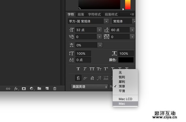 1. PS中选择苹方字体,渲染方式选择「Mac」