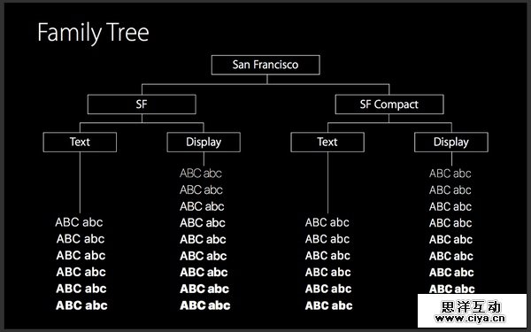 而英文方面,苹果加入了新的字体「San Francisco」[官方网站],该字族包含了有两个字体:为 iOS 和 OS X 设计的 SF,以及为 Watch OS 设计的 SF Compact ,而各自分为各自分为Text 和 Display,其中前者 6 个字重,后者 9 个(多了三个斜体)。