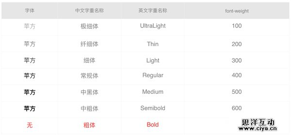 如果安装了 Mac 最新的 El Capitan(10.11) 里面就已经包含了该字体,较老的苹果系统,或者 Windows 用户就需要自行下载了。简体中文字体的英文名称是「PingFangSC」, 其中有6个字重可供选择。现在很多的App都是内嵌 Html 5,那么在设计的时候如何选择字体的字重呢?在 Html 中我们选择Font-Weight 来设置字体的粗细,下图就是字体的粗细与Font-Weight数字相对应的关系: