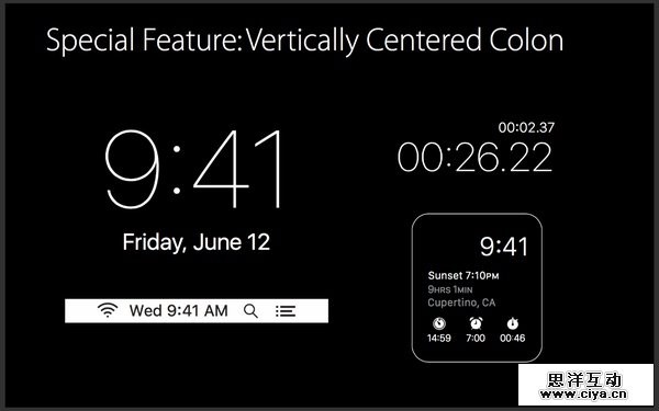 SF字体的另外一个特性是支持符号的整体居中,比如时间显示,之前的 Helvetica 的冒号是不居中的,但是新的字体调用其 API 可以实现居中。这样的特性有很多,感兴趣的朋友可以直接去官网查看[官方网站]。