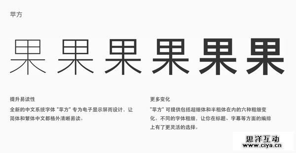 在iOS9 前的中文字体「黑体」被人诟病已久:喇叭口设计、仅包含2个字重,不仅在Retina的屏幕上不能达到很好的显示效果,并且随着iOS 7 开始的扁平化的设计语言,两个字重的「黑体」已经完全无法胜任设计的需求。就在去年,Google联合Adobe发布了「思源黑体」作为Android的默认中文字体,新的「思源黑体」不仅仅在字形上更易于在屏幕的阅读,并且拥有7个字重,充分满足了设计的需求。终于,iOS 9带来了全新的「苹方」,字形更加「优美」,且在屏幕的显示也更加清晰易读,拥有6个字重,满足了日常的设计和阅读需求。