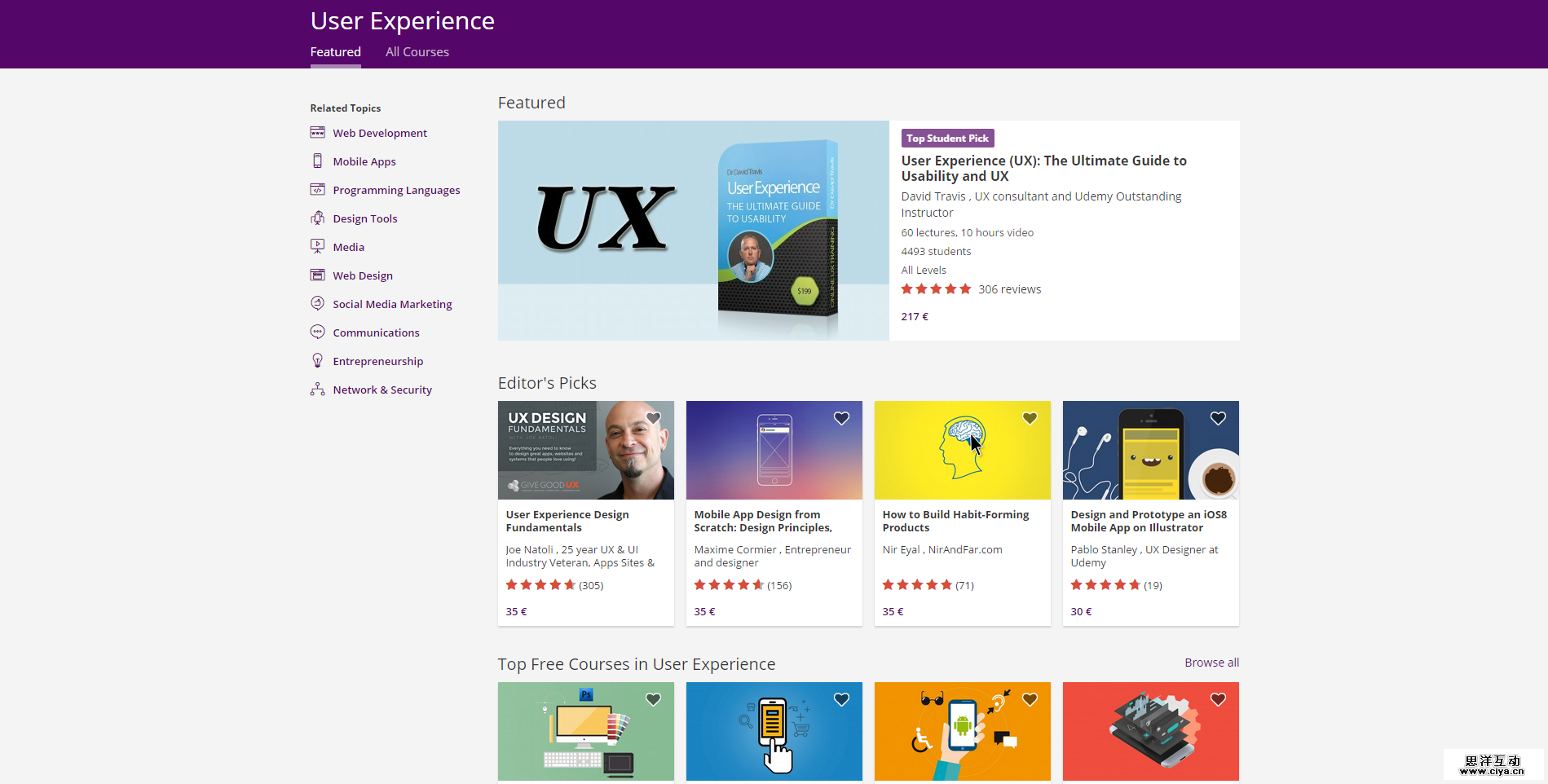 Udemy 是目前正在流行的学习平台,你可有在这里找到60多个用户体验相关的课程,其中有一部分是免费的。这些课程包含了不同的阶段,不同的层级,收费课程的价格是10欧元起。如果其中有你特别感兴趣的,不妨试试。