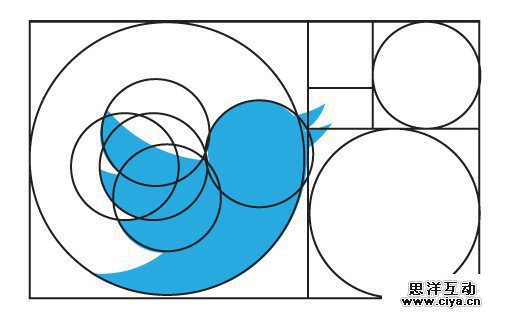 Twitter的LOGO设计则是借助若干完美的圆形来进行构建的,只不过它在使用黄金比例的圆形的时候,并没有使用相邻比例的圆形来构建,乍一看不够精确,但却同样营造出和谐的标识。