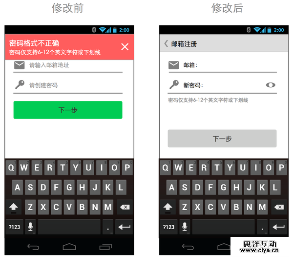 如何知道谁是主谋呢?猎豹的PM一般都会在产品上线前对各个元素进行埋点,我们只要去查每个元素的埋点数据就可以了。最后发现其中一个 “账号和密码格式错误” 弹窗的弹出比例很高,占到 “下一步” 按钮PV的10%,所以怀疑是用户经常输入错误格式才流失。有了数据,设计师马上知道问题出在哪里,”之前为了界面的简洁性,格式错误的弹窗是用户输入点击完成后才会检测的”,修改之后提示外露,并且输入正确后按钮才会亮起。这样定位且优化之后该步骤的流失大头马上被解决了,而且PM也觉得设计师很敏锐很厉害的样子。