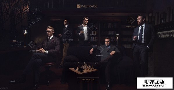 Weltrade 营造了华丽而晦暗的场景,作为一个着陆页,无论是桌面端还是触摸屏都可以轻松操作,不过页面中散落的菱形按钮,最好的操作介质还是手指。