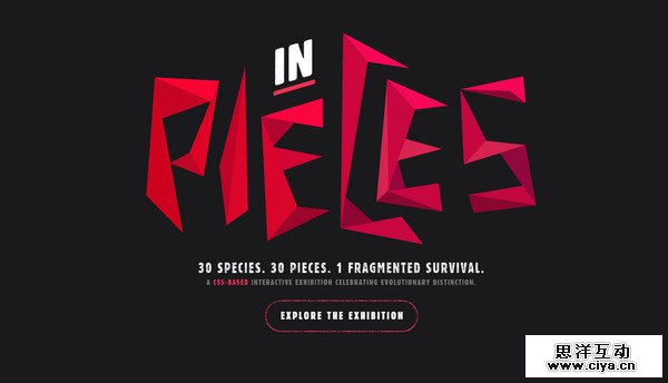 In Pieces 的页面展示了第一流的动态展示效果是怎样的,设计师巧妙地使用JS和CSS将多边形融入页面不同的元素中,让多边形元素赋予了页面全新的生命力。