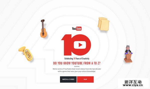世界最著名的视频网站Youtube 10周年的纪念网页肯定是不同凡响的,它会邀请访客参与一个关于流行文化的知识问答,中间穿插着有趣的动画,诱人的动效,漂亮的插画,当然,还有优秀的视频。