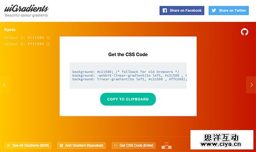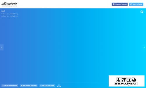 UIgradients 以分享美丽渐变色彩为主的分享站,里面接近上百种渐变配色方案,设计师可根据自己风格来选择搭配,此外我们还能直接获得对应渐变配色的CSS代码,相当方便,但要注意浏览器要兼容CSS3才行:)