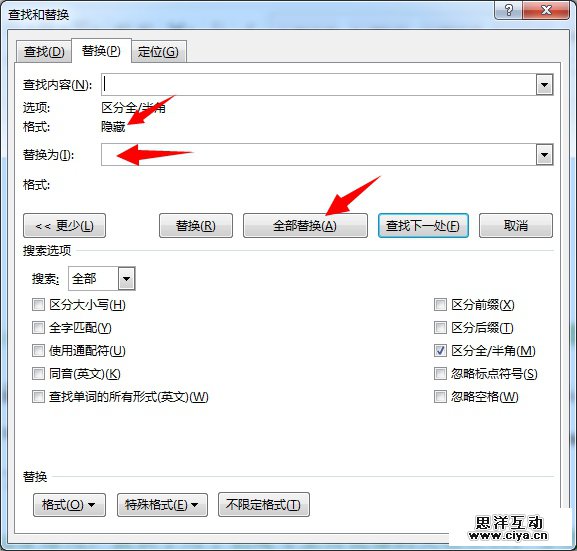然后点击确定,替换窗口会多出一条格式属性:隐藏,如下图所示。