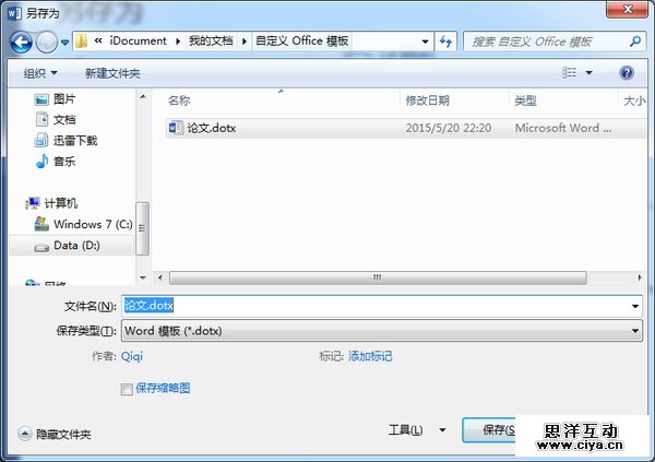 如果希望新建的 Word 文档中包含这些样式,将该空白模板另存为 .dotx 格式,路径为我的文档下的“自定义 Office 模板”,如下图所示。