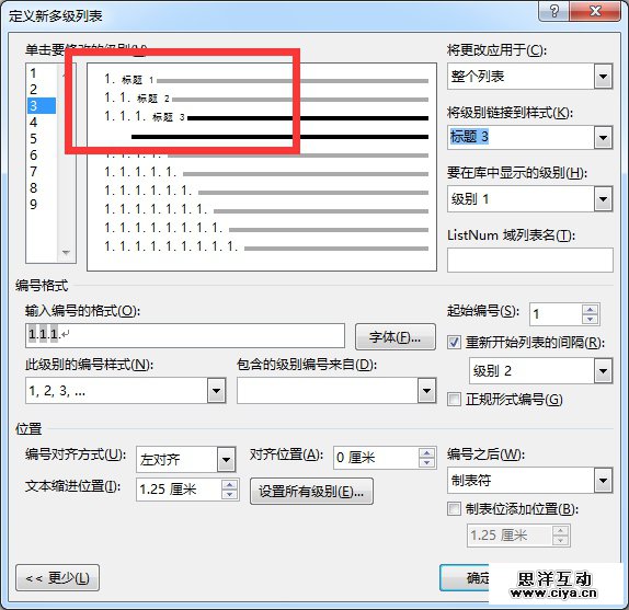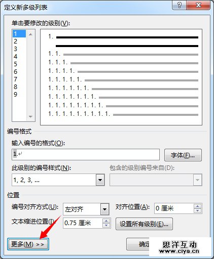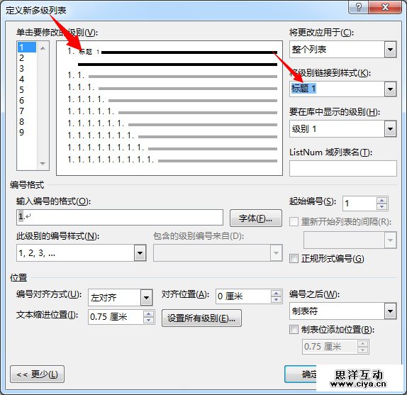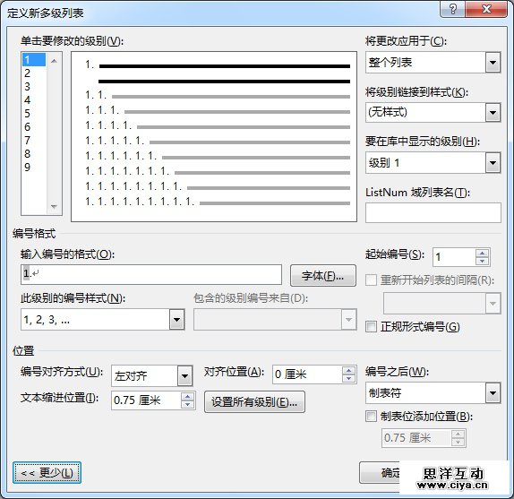 然后点击菜单下方的”定义新的多级列表“,打开如下对话框。
