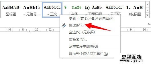 有些时候论文写了大半或者写完的时候需要调整论文的格式,比如正文字体变小一号,图片变成左对齐。这里不能全选然后更改字号,这样的话所有的字号都变成一样的了。笨一点的办法就是一段一段的选择,然后调整字号。稍微聪明一点的办法利用格式刷,一点一点的改。但是对于几十页甚至上百页的文章来说是非常耗时,而且容易遗漏,导致格式前后不一致。如果写作的时候就将样式与内容分离开,此时只需要在样式列表中的“正文”样式上点击右键,选择“修改…”,如下图所示。