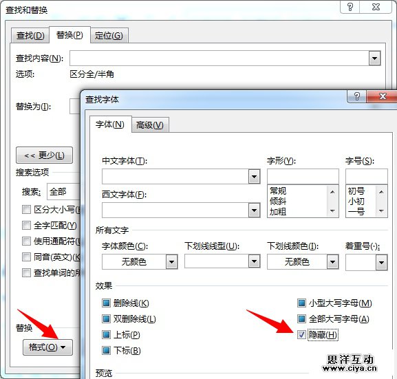当文档完成的时候,注释内容失去作用,又不想万一被人看见。利用替换功能删除这些注释即可。打开替换对话框,选择“格式”–“字体”,将“隐藏”复选框选中,如下图所示。