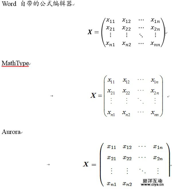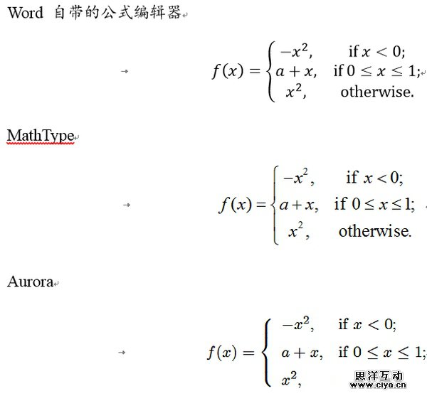 其实我不用 Word 自带的公式编辑器或者是 MathType 的最主要的原因就是,这两个产生的公式太丑了。美丑这个东西仁者见仁,我的审美也不是最优秀的,我贴几张对比图,如果感觉 Aurora 产生的公式最漂亮,可以继续往下看,如果感觉差不多,可以跳过这一章。