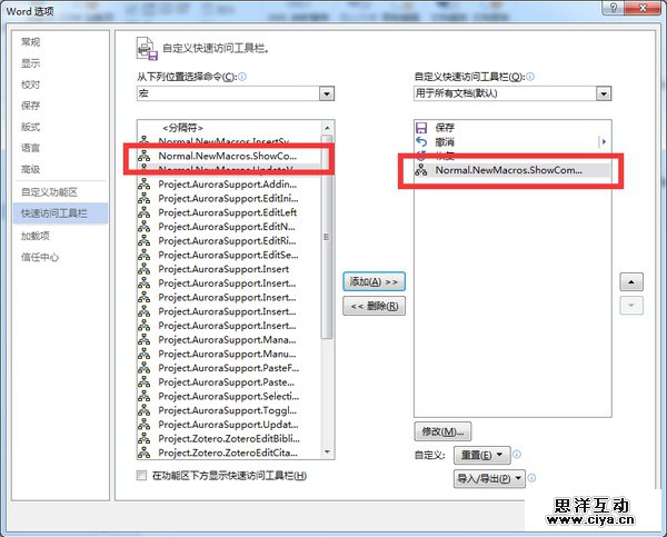 在打开的对话框中将刚刚创建的宏添加到快速访问工具栏,如下图所示。