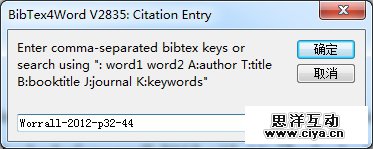 插件会弹出一个输入框,这里输入的是 BibTeX Key。用 JabRef 的都知道这个东西,如果用其他软件也不要紧,这一步骤是你告诉插件到底要引用数据库中的哪篇文章。BibTeX Key 就是 JabRef 用来标记文献的。