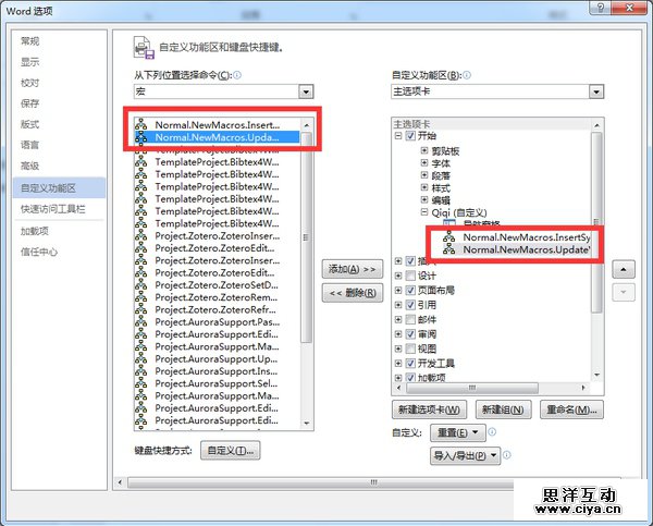 这样两个宏就创建好了,为了方便的调用,将这两个宏添加到工具栏中。打开自定义工具栏窗口。找到刚刚新建的两个宏,将他们添加到开始选项卡中(凭个人喜好,爱放哪放哪)。