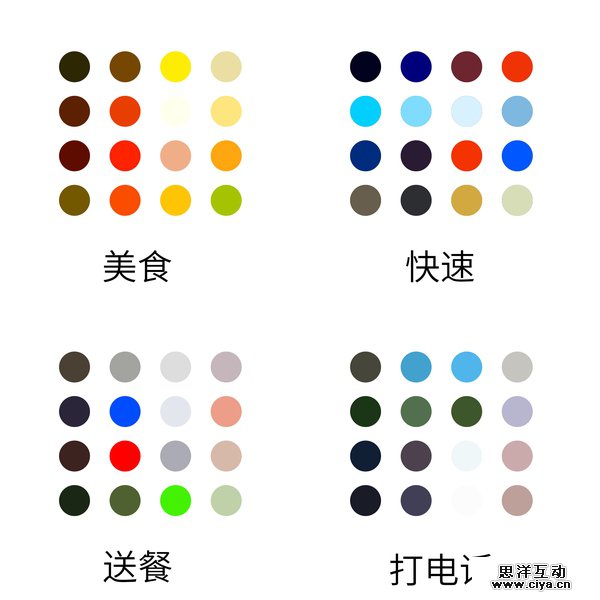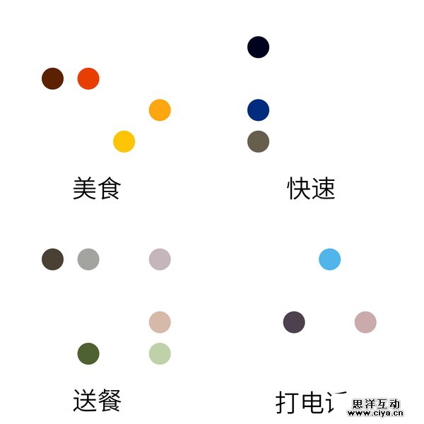 接着是第二次颜色筛选,主要去掉竞品色(美团外卖、饿了么、百度外卖、达达、派乐趣、点评、京东到家、爱鲜蜂等)和脏色。当然去掉之后发现基本没什么可用的颜色了,因此还有一个问题就是,如果竞品色不足以影响到我们的品牌色的话(在可控范围内),还是可以采用的。具体这个决策过程需要大家一起讨论决定。