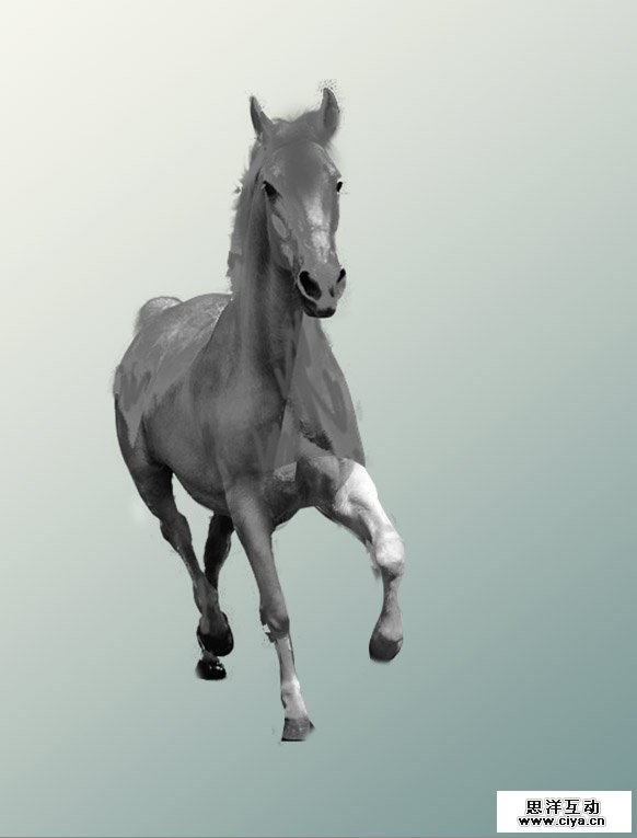 二、新建一个图片,参照原图色彩,拉一个渐变背景色。把素材图中左边的马抠出来,拖放到新建图层上,执行 去色—拉低曲线,如下: