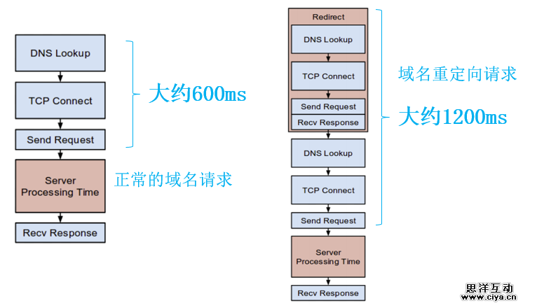 这是一个同一网速下的测试结果,重定向之所以会比较慢,是因为它重复了域名查找,tcp链接,发送请求。