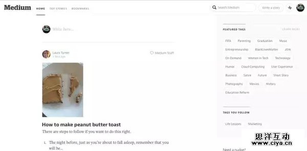 Medium的极简主义独特之处不仅在于外观:写作体验被网站运营者们视为重中之重,尽可能让新用户尽快上手,并且不会被那些小玩意、插件或其他功能所干扰。这不是说网站风格平淡无味,想想看,你看不到那些优雅的印刷体,或者是像其他网站上不断滚动的新闻条,是不是觉得耳目一新了?