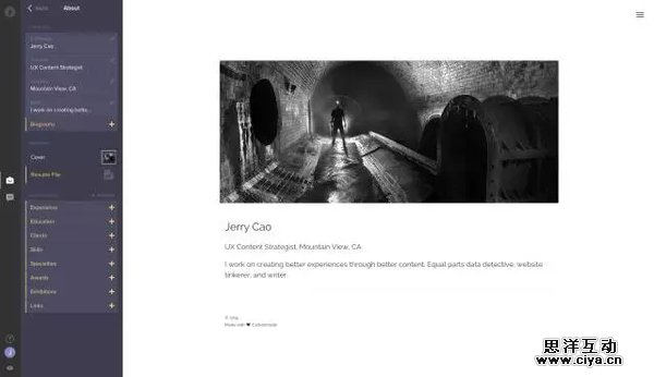 当你潜入更深一些,你会发现Carbonmade能够用Medium式的流畅体验来满足一切用户自己建站所需要的功能。创建你的方案,拖拉放下你想要展现的东西,在左手边的导航栏输入文字,想要的界面立马呈现。