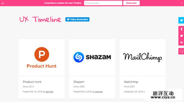 UX Timeline 目前有9个网站列表,分别是Product Hunt, Shazam, Mailchimp, Vimeo, Dropbox, Spotify, Uber, AirBnB, Deezer 等互联网品牌网站。