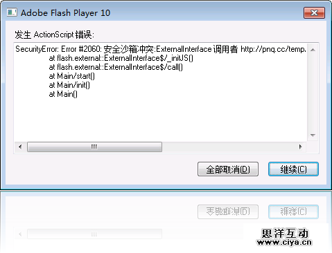在Chrome、Firefox等非IE浏览器上,是没有问题的。在“纯正”的IE6、IE7、IE8上也是正常的。但是在傲游、360浏览器、腾讯浏览器等基于IE的多标签浏览器中,刷新页面的时候,Flash播放器还是会抛安全沙箱错误。 使用上面说的“基于IE的多标签浏览器”访问,你会看到,第一次是正常的,刷新之后就不正常。如果你安装的是debug版本的播放器,可以看到Flash运行时发生了异常。