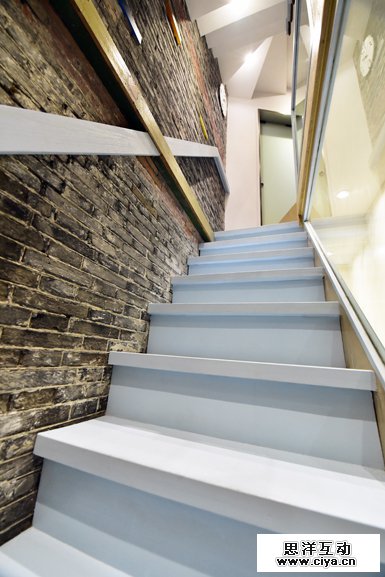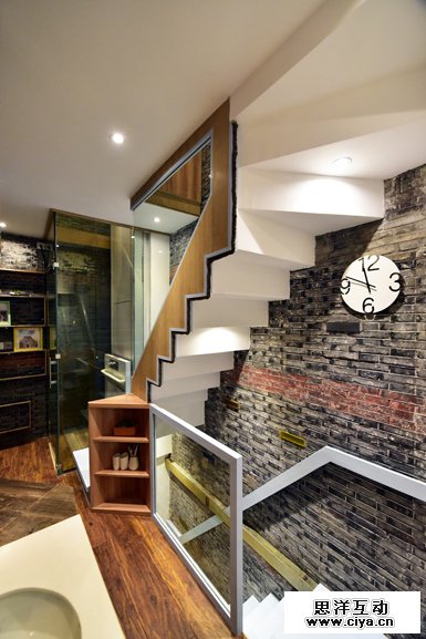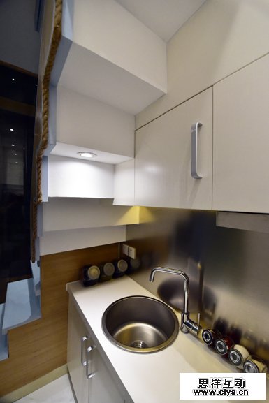 为减缓上下楼的压力,一层台阶下方设置多个不同收纳空间,剩余空间置入了厨房