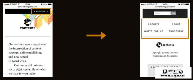 对于小屏幕来说,驯服脱缰野马的导航的一种方法是将一个链接列表,转化为一个选择菜单。这就避免了顶部导航方法提出的问题,并且这是一个节省地方的聪明方式。