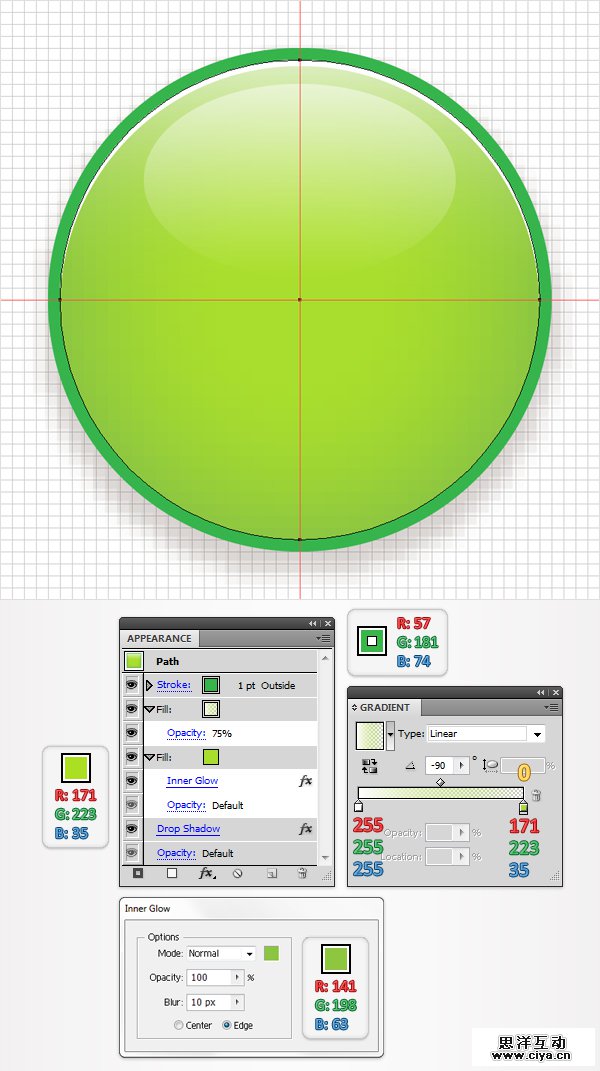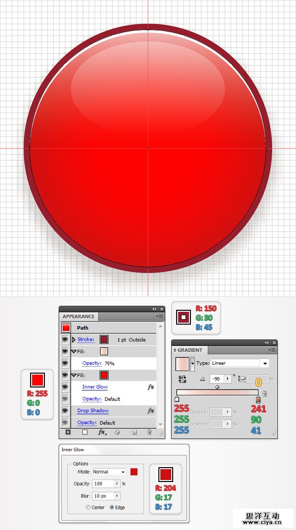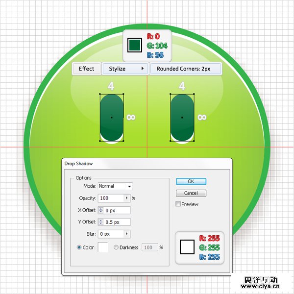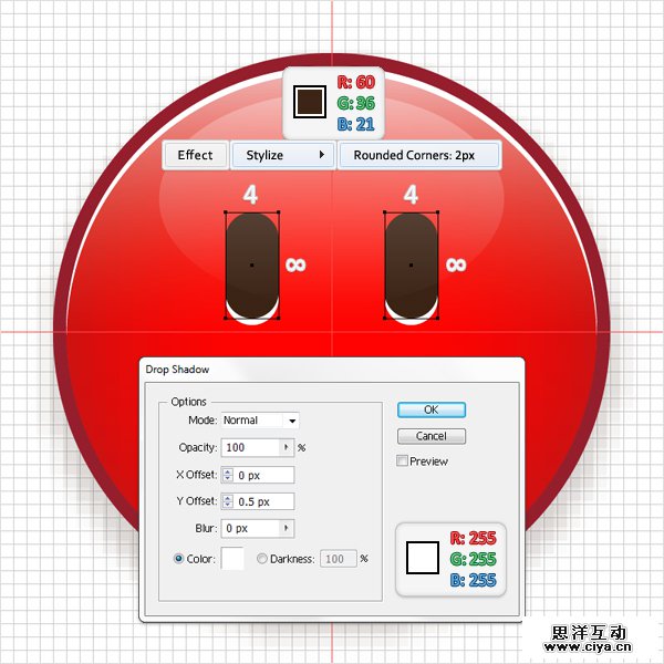 对齐网格会减轻你的工作。 填满所有R = 96,G = 57,B = 19,然后去影响>风格化>圆角。 输入2 px半径,单击确定,然后去>风格化>阴影效果。 输入数据所示,然后单击确定。