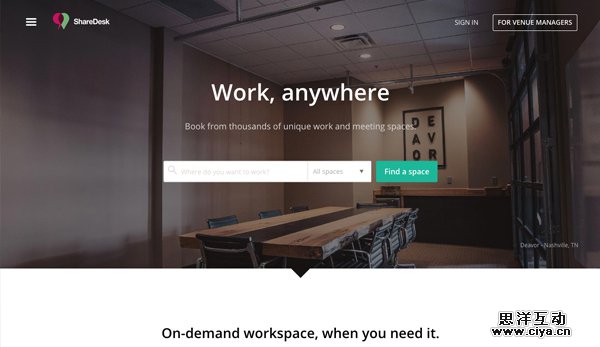 ShareDesk市场为游牧工作者提供一个平台,在平台上可以浏览并按小时、按天或按月预定办公室和会议室。