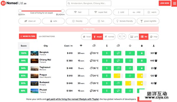 Nomad List能够明确地为你的目的地寻找旅游景点,提供物价信息,联系其他“流浪者”,还能帮助你有效地找到更多便利的信息。