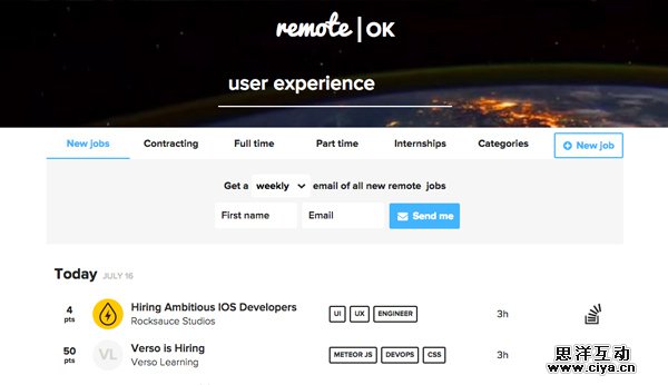 Remote OK是一个实时更新的远程工作发布网站,每天都有新工作发布出来。很多刚刚创立的新公司会选择在这里发布工作,如Buffer、Zapier、Automattic,如今有类似需求的公司非常多。
