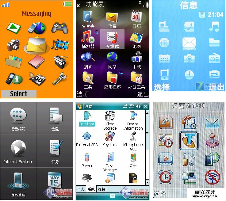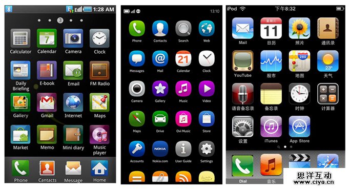 07年iPhone发布了,以前的贵族诺基亚可能没想到厄运从今年开始了。手机主题的风向也变了,以前的手机主题上的各种轮廓形状的图标一下被一统江湖了。大家看看这是07年的各家手机界面,大家猜猜看能看出那是哪家的手机界面吗?