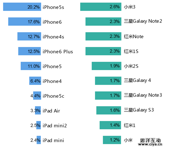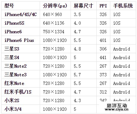了解了手机屏幕的相关概念后,我们来关注一下市面上手机的屏幕参数。市面上的手机型号种类繁多,我们只需要选取具有代表性的、使用人数比较多的手机型号进行研究。以下数据来源于应用统计分析平台友盟。