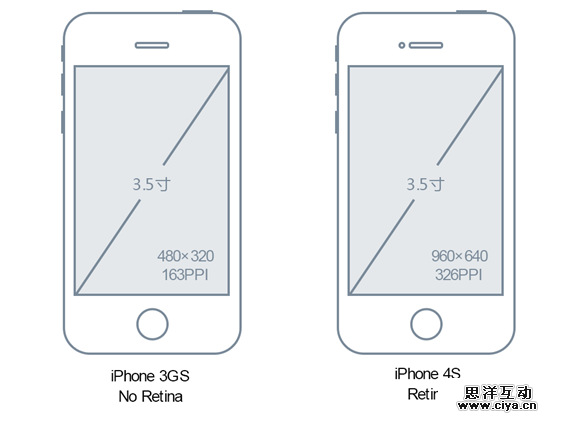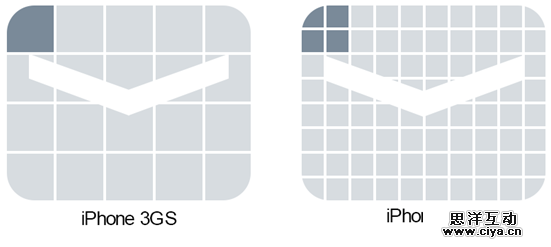 当DPI的概念用在手机屏幕上时,表示手机屏幕上每英寸可以显示的像素点的数量。这时候我们用PPI来描述这个屏幕。屏幕生产工艺越高,每平方英寸就能容纳更多的像素。例如iPhone 3GS的屏幕像素是320×480,iPhone 4s的屏幕像素是640×960。两款手机屏幕的物理尺寸都是3.5英寸,但像素密度(PPI)不一样。(如图1-11所示)iPhone 4s的Retina屏幕把2×2个像素当1个像素使用。在同样的物理面积内填充了更多的像素,所以显示效果更加精细。