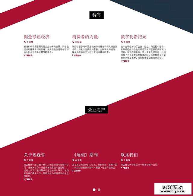 比如在埃森哲官网中,白色背景、红色标题、黑色正文的对比,以及红色背景与白色文字对比的应用,将文字内容清晰衬托出来,既有丰满的层次感,同时有具有很强的视觉冲击力。