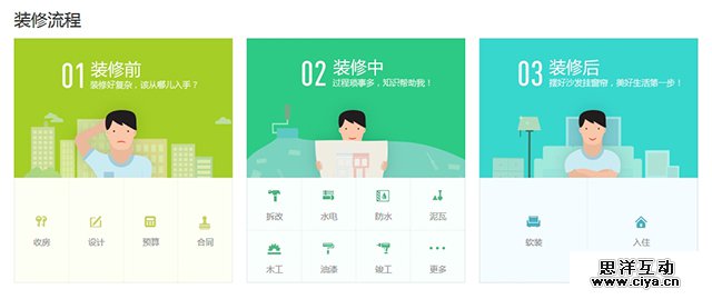 比如土巴兔装修网的流程,标题文字在图片同样的位置、采用同样形式,既与图片背景颜色形成对比,又是文字样式的重复。