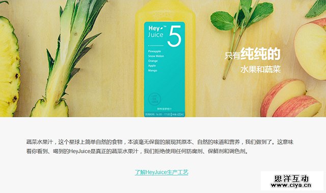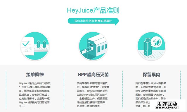 比如HeyJuice网站在产品准则部分采用了统一的“图片+标题+正文”形式。内容不同,而布局方式统一,图片风格一致。用户一眼看过去,就能知道这是属于同一个版块的内容,这样的重复很容易有一种连贯、平衡美感。