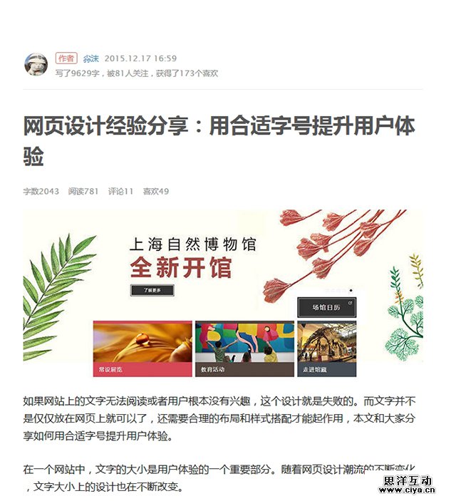 比如简书16号字体,行间距27px/段间距36px=75%。文字字号本身比较大,所以行间距也不需要严格按照1—1.5倍的比例设置,不过行间距和段间距的比例符合75%,看起来很不错,这样的视觉效果让人在阅读时保持一种节奏感,这就是在实际情况中将规范的灵活应用。