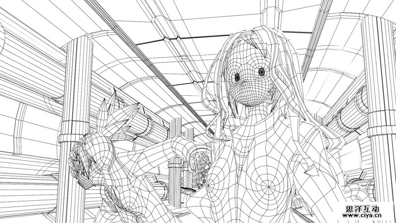 在3DCG软件中创建角色模型。这里得花些时间,一旦成型只需改变动作。动作的变化和背景的调整都要配合分镜。