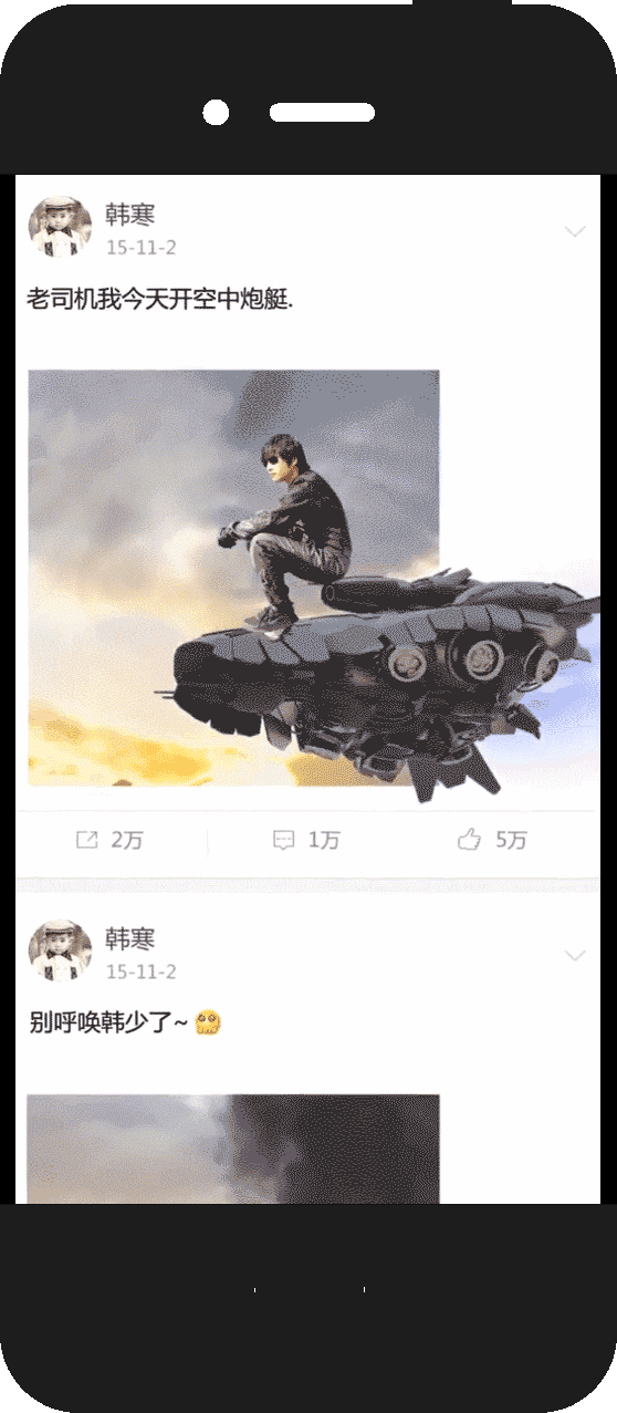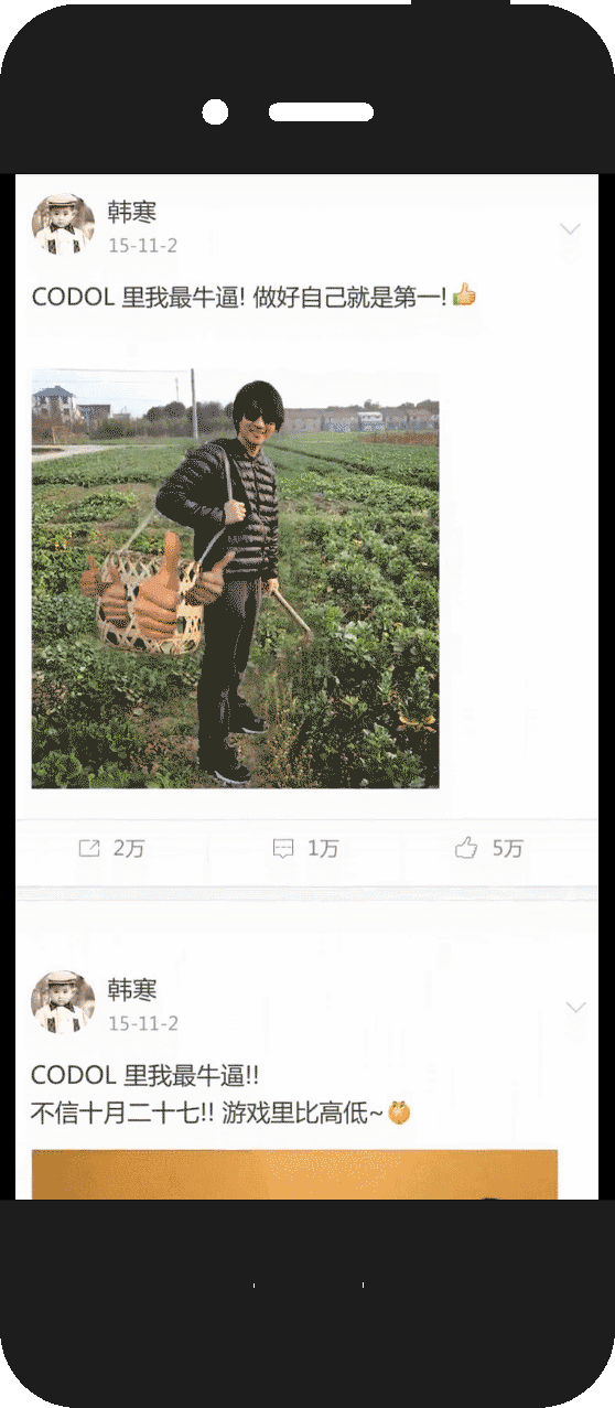 但是想要拍摄这么一支画面唯美,镜头到位的高逼格MV,通过咨询韩寒的经纪人得知这几乎是不可能的事情。就在这个艰难的时刻突然一位同学说能不能用韩寒的静态照片做成动画在配上这首“优美”的歌曲呢?大家都觉得这个想法还不错。起初的想法是基于ios10系统更新后韩寒手机相册的变化这个点来进行,最后我们觉得微博的浏览方式会更加简洁而且真实,说不定玩家会真正的去他微博查看原片,这样带入感更加好。加上韩寒自己微博大V的身份,在后续的传播上能给我们的数据锦上添花。最后我们毅然的决定重新改造韩寒的“微博”。