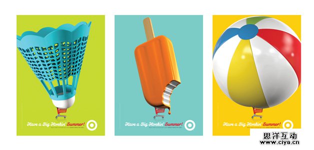 有些时候,在尺寸与比例上做调整,尝试对比极端的尺寸与比例,可以让一张暗淡的画面出彩。在这个给夏日活动做的系列海报中,我仅仅展示了一辆超市手推车与一件产品。但是,夸张的产品比例,呼应了醒目的标题,让视觉印象变得有趣。
