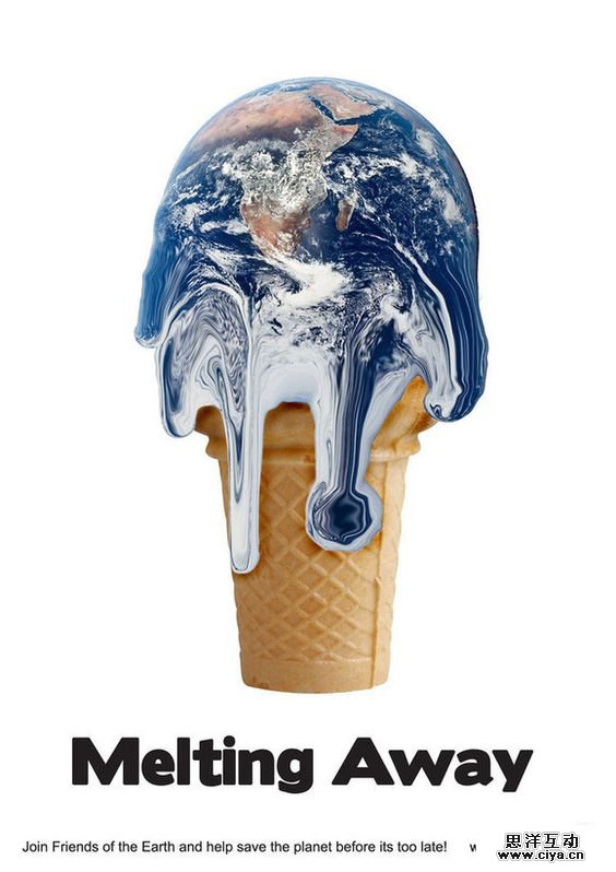 全球变暖的主题是不是很沉重,暖联想到夏天,大夏天的绝对离不开冰激凌的说。串起来想,这个思路是不是也没怎么费劲。懒到点子上,省时省力还能增加海报趣味性,更有亲和力的原因是用了深受大众喜爱的食物。秒懂之后,更能发人深省哦。